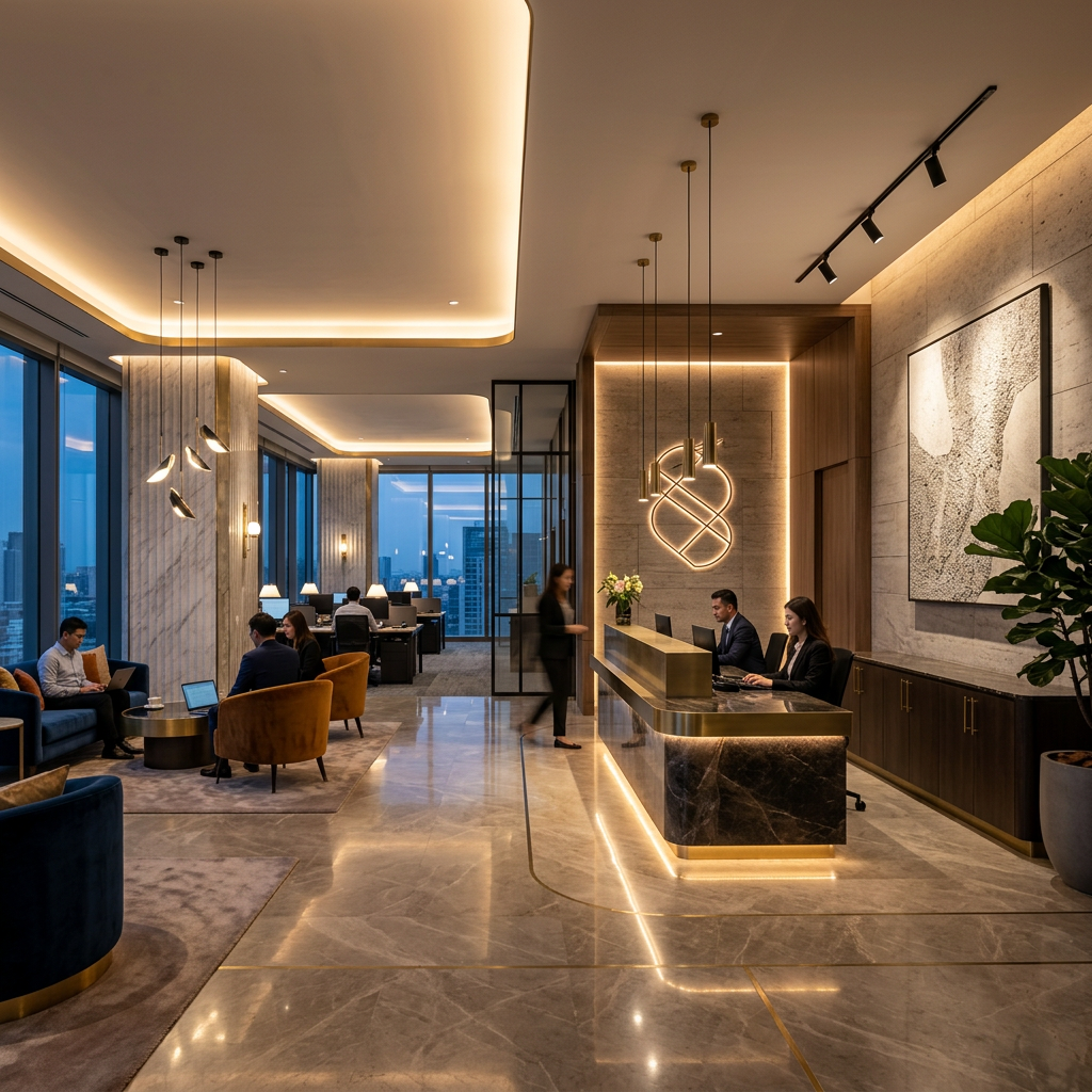 Luxurious retail interiors combining warm 2700K layered lighting with tactile, premium materials.