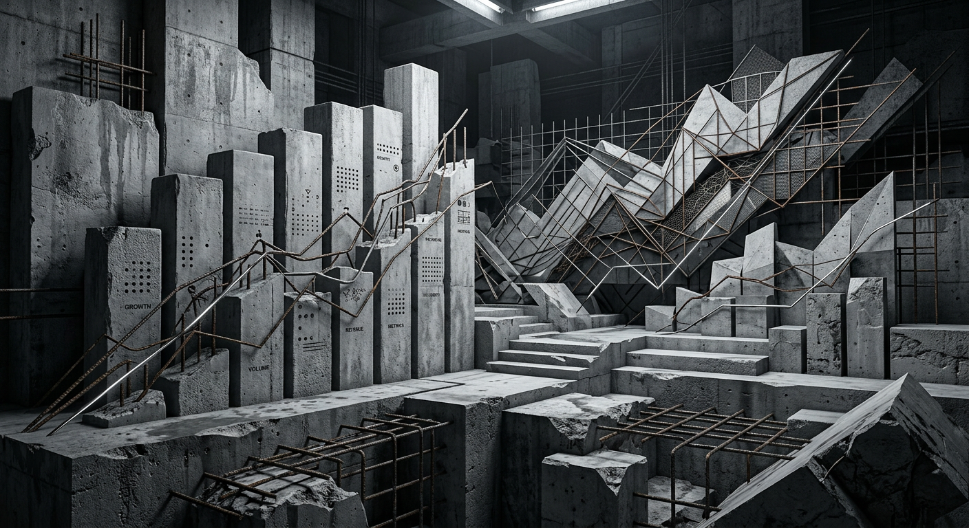 Raw, architectural brutalist aesthetics with heavy textures and monochromatic schemes for B2B industrial dashboards.