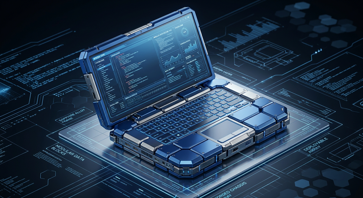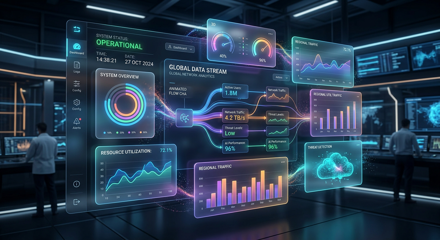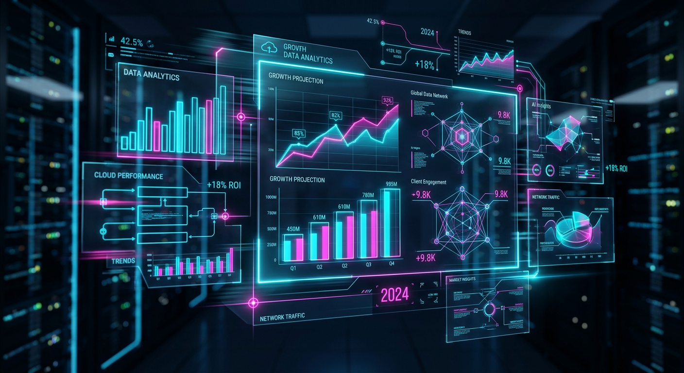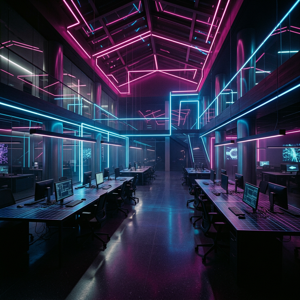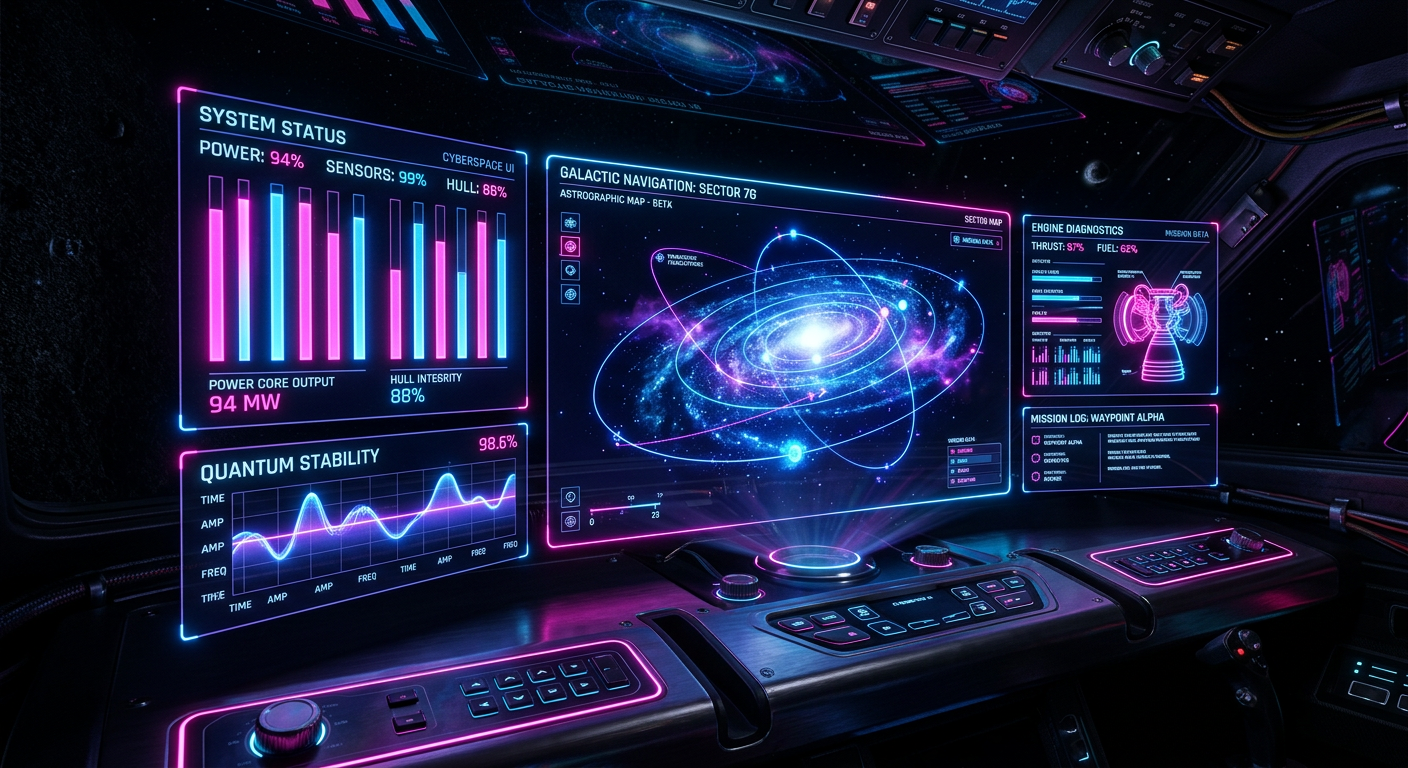 Neon accents with high-contrast dark mode aesthetics and holographic data overlays.