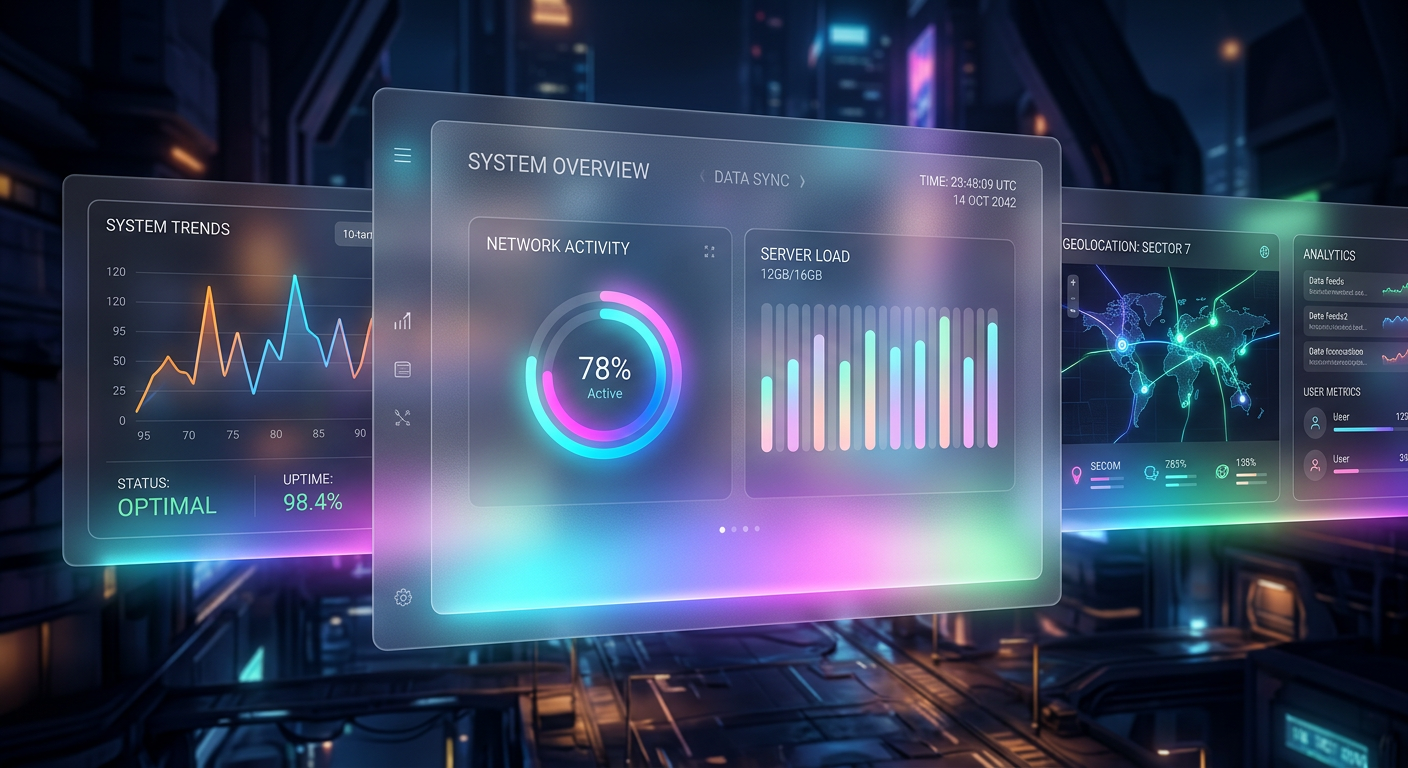 A modern UI aesthetic utilizing frosted glass layers, soft blurs, and glowing sub-surface colors.