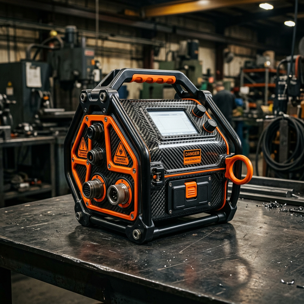 Heavy machinery aesthetics showcasing woven carbon fiber and powder-coated warning colors.