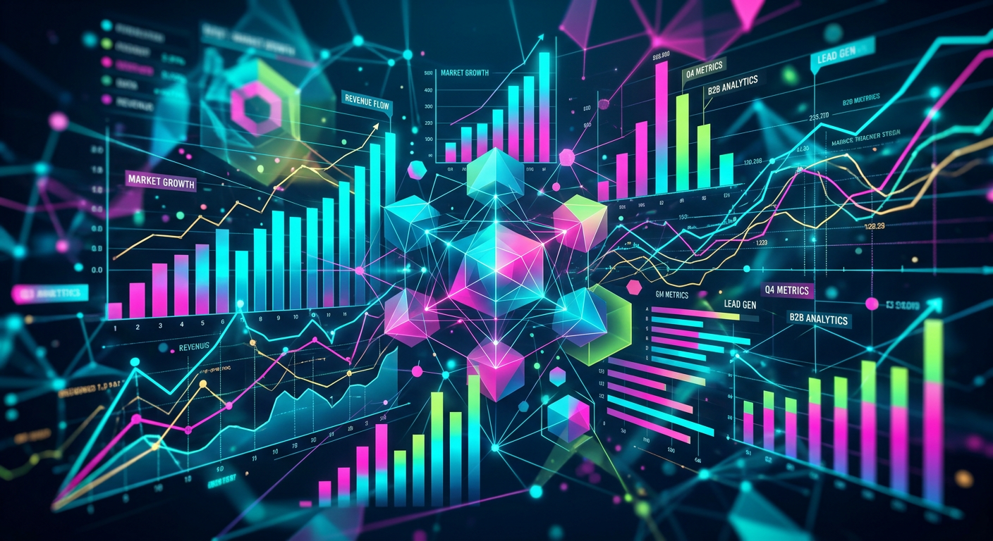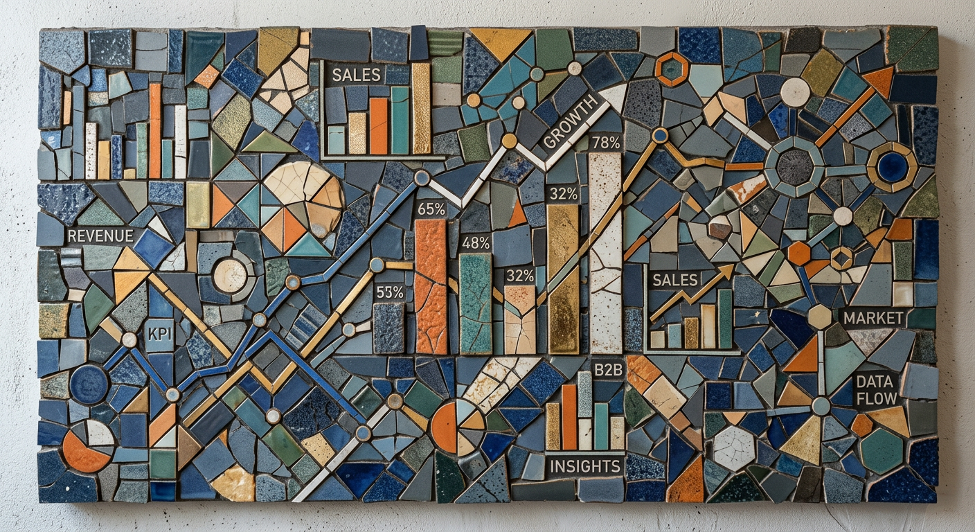 Intricate mosaic tiles assembling real metrics and case studies into compelling narratives for marketing teams.