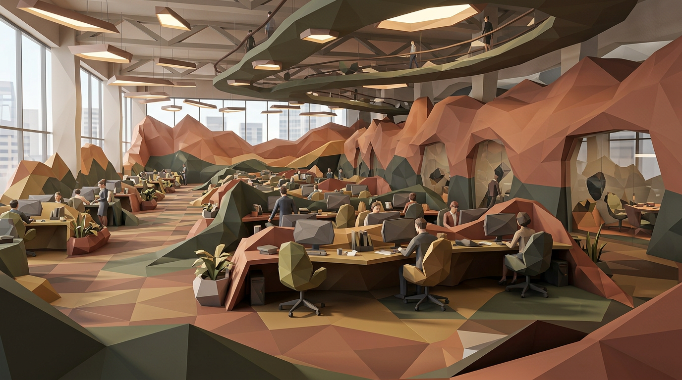 Low-poly landscapes in earthy terracotta and forest greens for eco-friendly apps tracking sustainability and farming data.