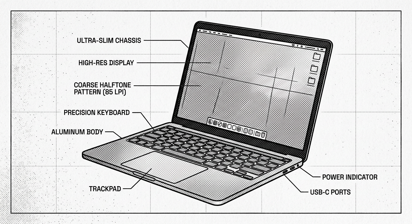 1970s technical illustrations utilizing coarse halftones and striking single-spot color highlights.